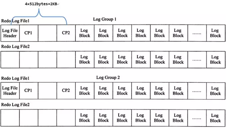 在每个组的第一个redo log file中,前2KB记录4个特定的部分,从2KB之后才开始记录log block。除了第一个redo log file中会记录,log group中的其他log file不会记录这2KB,但是却会腾出这2KB的空间。如下: