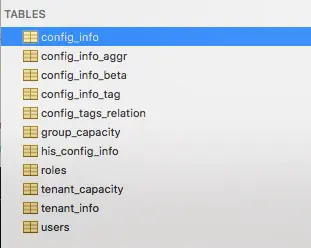 第二步:初始化MySQL数据库,数据库初始化文件:nacos-mysql.sql,该文件可以在Nacos程序包下的conf目录下获得。执行完成后可以得到如下图所示的表结构: