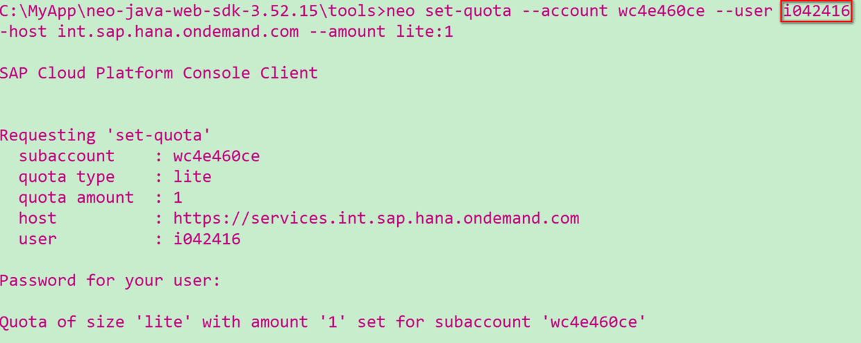 使用命令行neo set-quota --account wc4e460ce --user i042416 --host int.sap.hana.ondemand.com --amount lite:1 给subaccount分配一个计算单元: