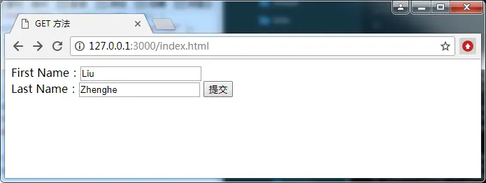 执行 node express05get.js,在浏览器访问 127.0.0.1:3000/index.html,向表单输入数据并提交。