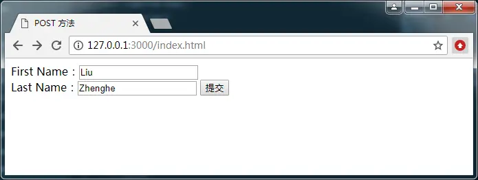 执行 node express06post.js,在浏览器访问 127.0.0.1:3000/index.html,向表单输入数据并提交。