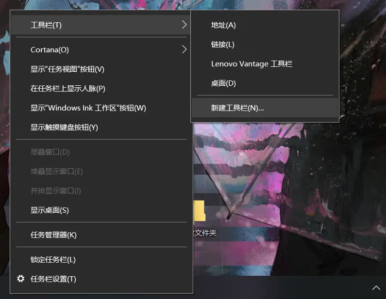 在桌面新建一个空文件夹,然后右键单击任务栏空白处,并选择「新建工具栏」,在弹出的窗口中选择你刚才新建的那个文件夹。