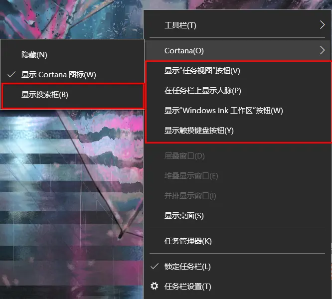 我比较喜欢Mac Os的dock外观,所以接下来,就是对任务栏进行美化了。首先,右键单击任务栏空白处,将红框部分全部取消勾选: