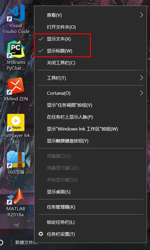 然后取消勾选新建工具栏的显示文本及显示标题属性,再次锁定任务栏,删除新建文件夹: