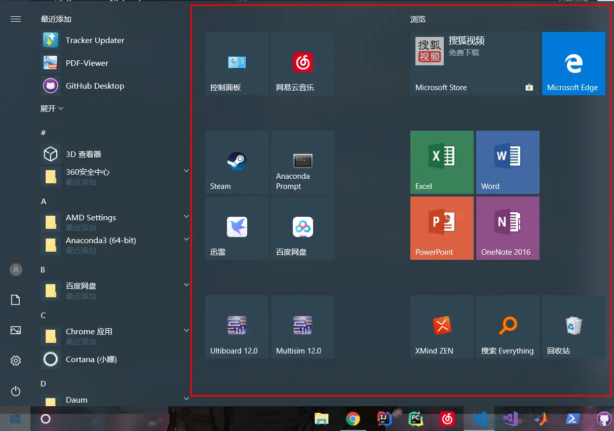 隐藏桌面后,我选择使用任务栏 + 开始菜单来代替桌面的快捷方式,任务栏放5到6个最常用的软件,其他的软件快捷方式就放在开始菜单那里。