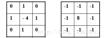 拉普拉斯算子是一种常用的二阶导数算子。实际中可根据二阶导数算子过零点的性质来确定边缘的位置。常用的两种模板分别如图所示: