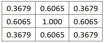 假如现在整个图像共有9个像素点,中心点为原点,并且令σ为1(标准正态分布):