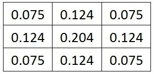 现在这九个像素值加起来等于4.8976,由于加权平均权值的和必须等于1,因此这九个像素值吗每个都必须都除以4.8976,得: