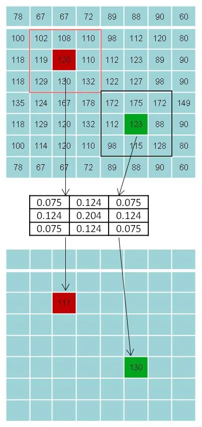 接着将该正态分布的权值放入卷积核当中,然后对整个图像进行卷积。卷积结束之后,高斯模糊就算是完成了。