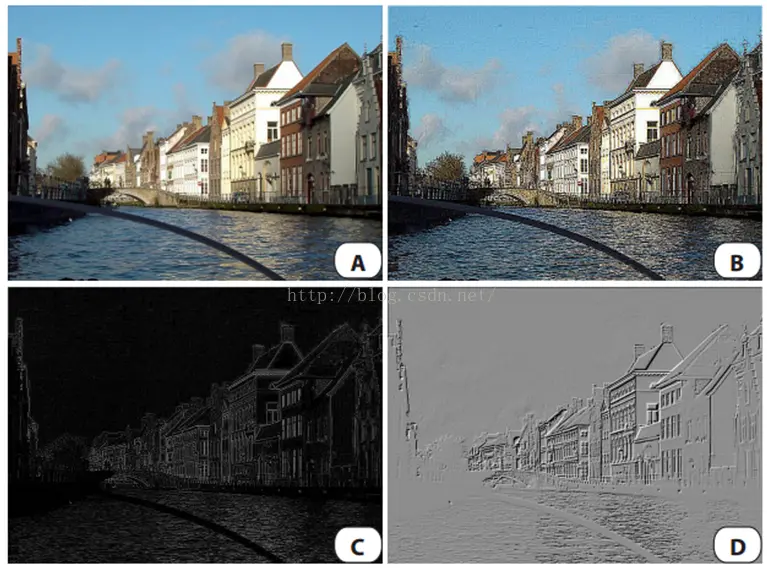 A:原图像。B:锐化。C:边缘检测。D:浮雕