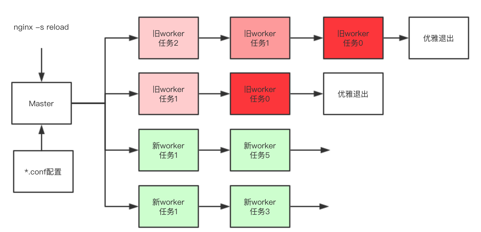 - 老worker进程关闭监听句柄,处理完当前链接后结束进程