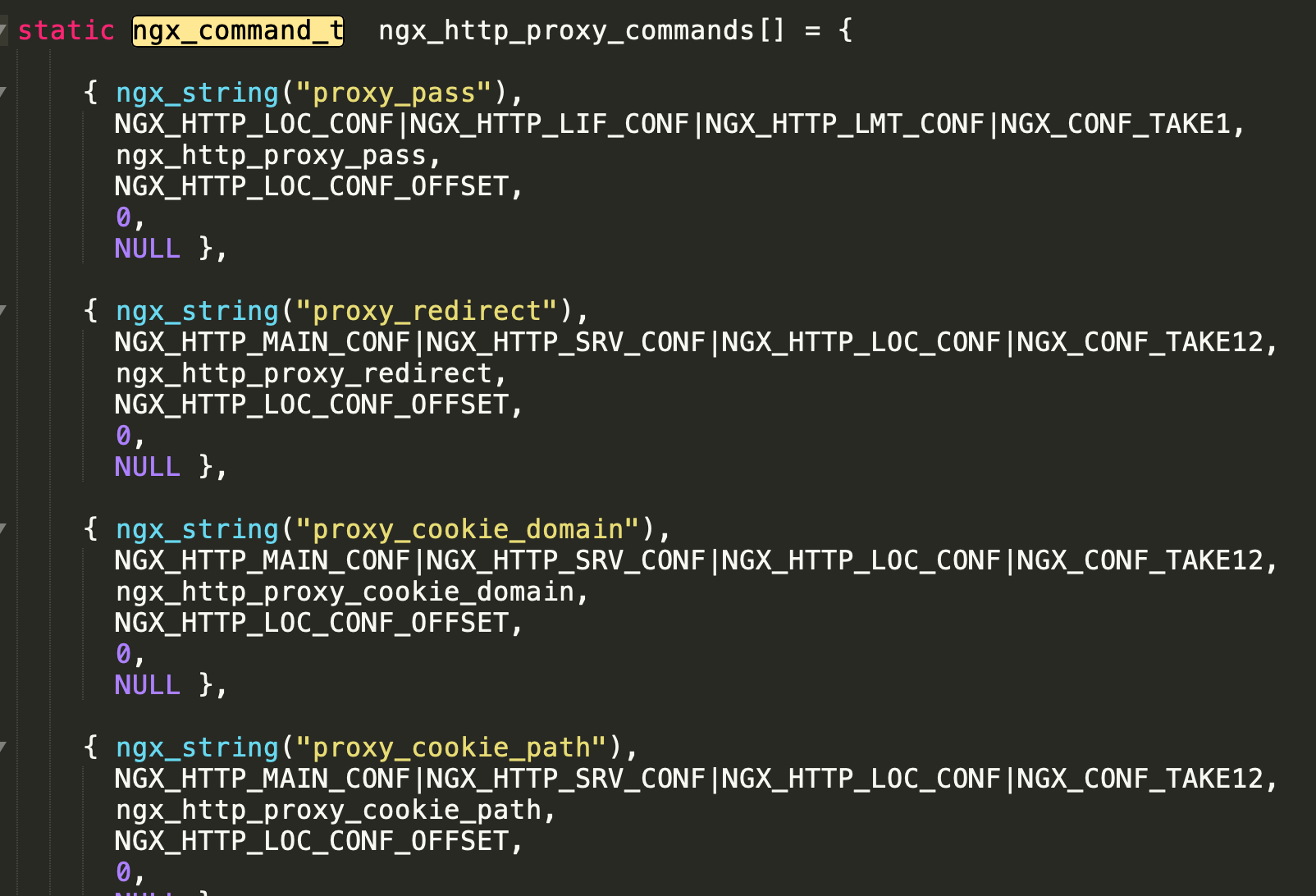 我们找到了 ngx_http_proxy_module.c 文件, 找到 ngx_command_t,下面配置了所有的相关指令,如果官方文档不全,可以用此快速参考学习.