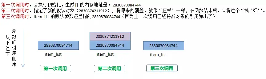 对于参数中提供了初始值的参数,由于 Python 中的函数参数传递的是对象,也可以认为是传地址,在第一次初始化 def 的时候,会先生成这个可变对象的内存地址,然后将这个默认参数 item_list 会与这个内存地址绑定。在后面的函数调用中,如果调用方指定了新的默认值,就会将原来的默认值覆盖。如果调用方没有指定新的默认值,那就会使用原来的默认值。