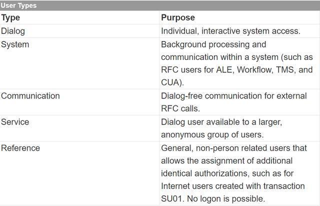 - Reference: General, non-person related users that allows the assignment of additional identical authorizations, such as for Internet users created with transaction SU01. No logon is possible.