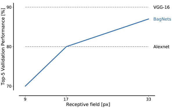 在ImageNet上具有不同贴片尺寸的BagNets的性能。即使对于非常小的贴片尺寸,BagNet上的BagNets性能也令人印象深刻:尺寸为17 x 17像素的图像特征足以达到AlexNet级别的性能,而尺寸为33 x 33像素的特征足以达到约87%的前5精度。通过更仔细地放置3 x 3卷积和额外的超参数调整,可以实现更高的性能值。