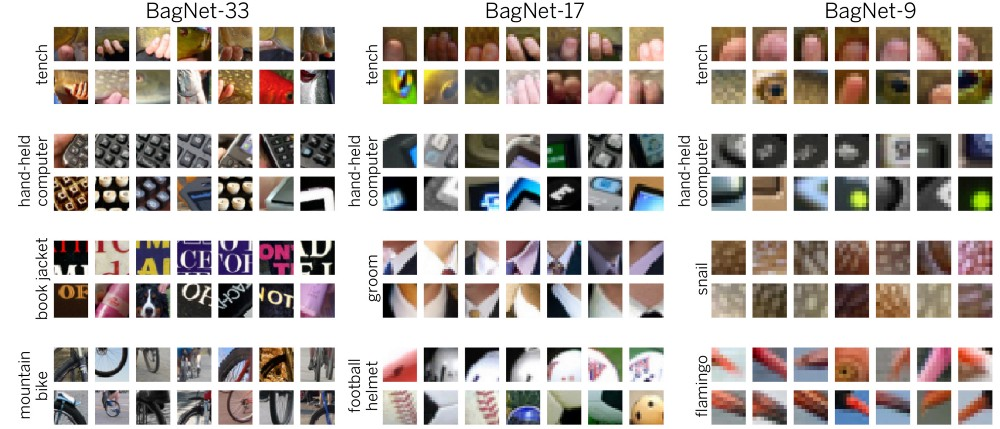 BagNets的一大特色是他们透明的决策。例如,我们现在可以查看哪个图像特征对于给定的类最具预测性(见下文)。例如,通常用绿色背景上的手指识别丁字裤(非常大的鱼)。为什么?因为这个类别中的大多数图像都有一个渔民像奖杯那样举起了一张十字架。每当BagNet错误地将图像分类为tench时,通常是因为图像中某处的绿色背景上有一些手指。