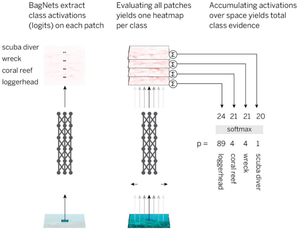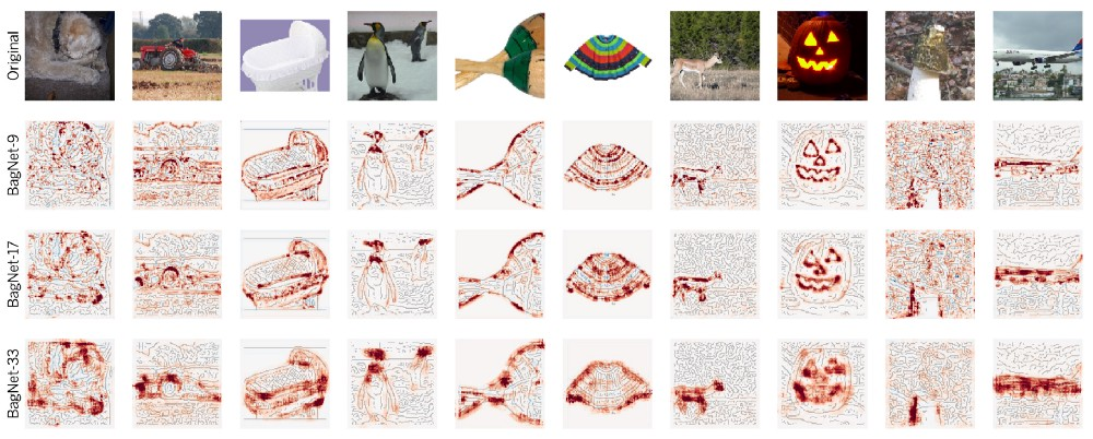 来自BagNets的热图显示了确切的图像部分对决策的贡献。热图不是近似的,而是显示每个图像部分的真实贡献。ResNet-50与BagNets惊人相似
