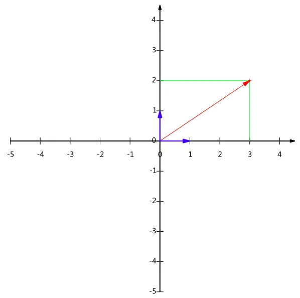 不过我们常常忽略,只有一个(3,2)本身是不能够精确表示一个向量的。我们仔细看一下,这里的3实际表示的是向量在x轴上的投影值是3,在y轴上的投影值是2。也就是说我们其实隐式引入了一个定义:以x轴和y轴上正方向长度为1的向量为标准。那么一个向量(3,2)实际是说在x轴投影为3而y轴的投影为2。注意投影是一个矢量,所以可以为负。