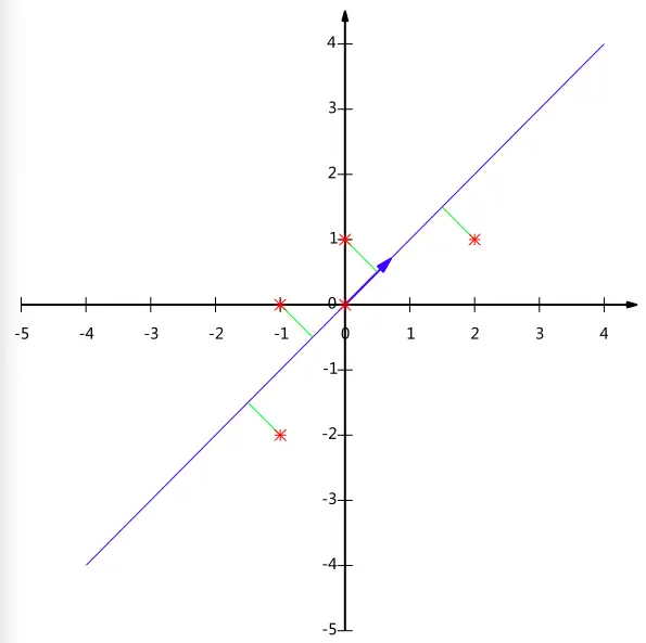 以上图为例,可以看出如果向x轴投影,那么最左边的两个点会重叠在一起,中间的两个点也会重叠在一起,于是本身四个各不相同的二维点投影后只剩下两个不同的值了,这是一种严重的信息丢失,同理,如果向y轴投影最上面的两个点和分布在x轴上的两个点也会重叠。所以看来x和y轴都不是最好的投影选择。我们直观目测,如果向通过第一象限和第三象限的斜线投影,则五个点在投影后还是可以区分的。