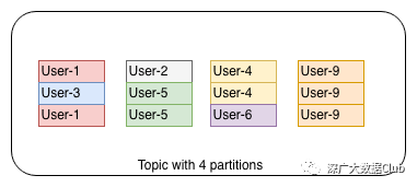 对于4个分区的主题,每个分区都有对应Key子集的日志,其顺序与推送顺序相同。虽然多个数据源可以以不同的间隔写入主题,但是两个源不应该为单个密钥生成数据,因为时间戳和写入间隔可能不同。