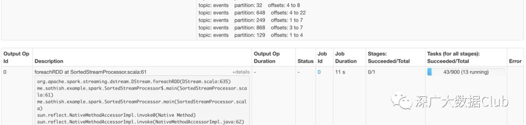 在下面的屏幕截图中,您可以看到900个分区的主题(我的设置建议最多),Spark创建了所有可用执行程序并行处理的相同数量的任务。大量分区会增加每个批处理的处理时间,从而导致流式传输管道的延迟。