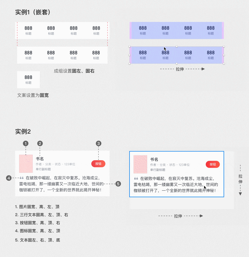 如果一个组件需要同时支持上下左右同时拉伸时,设置项就相对复杂了一些,这里我们还是来通过实例来认知一下概念,如下图(实例2)