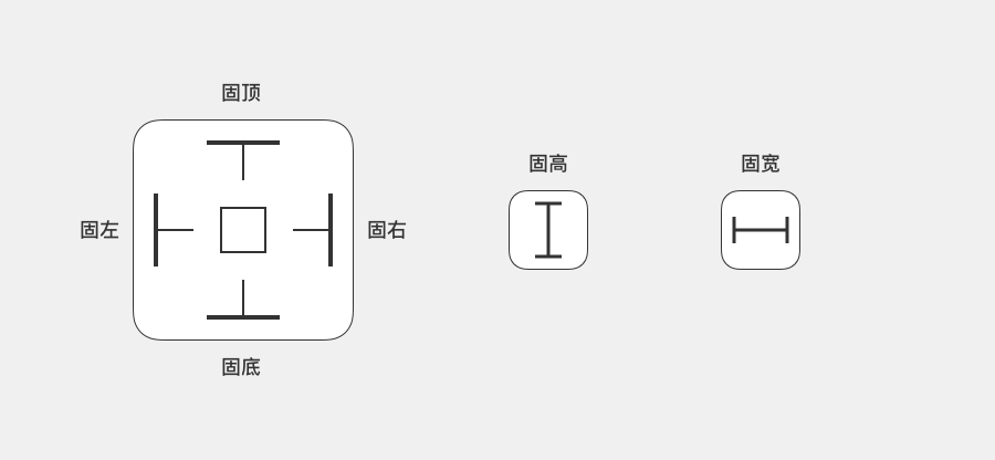 具体我们稍作一下解释,前四个从图标就可以看出分别是固左、固右、固顶、固底,后两个分为为固高、固宽;对一个元素设置了固左、固宽后,执行左右拉伸操作时设置的元素就有了左对齐的适配效果;对一个元素设置了固顶、固底后,执行上下拉伸操作时设置的元素就有了固定间距的适配效果;除此以为也有一些组合是相冲的,比如设置了固左、固右后,是不能再这种固宽的,这两个也是一种相反的效果。