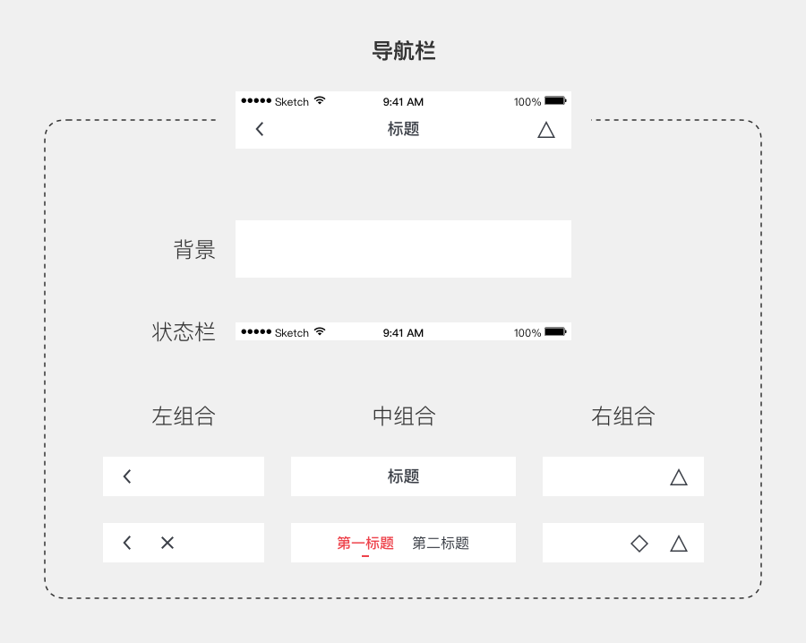 位置、尺寸的结构细分:起点读书拥有近百种导航栏的样式,但是从布局结构上来看,大致可拆分为状态栏、背景、左操作项(左组合),中间展示项(中组合),右操作项(右组合)这五个模块,每个模块可以独立产生新的样式或向下细分新模块以适应新的产品需求;不过这里有两个注意点,一般模块拆解到按钮、图标等最细颗粒后通常不会再进行拆分,并且拆分模块不建议层级超过4个层级。