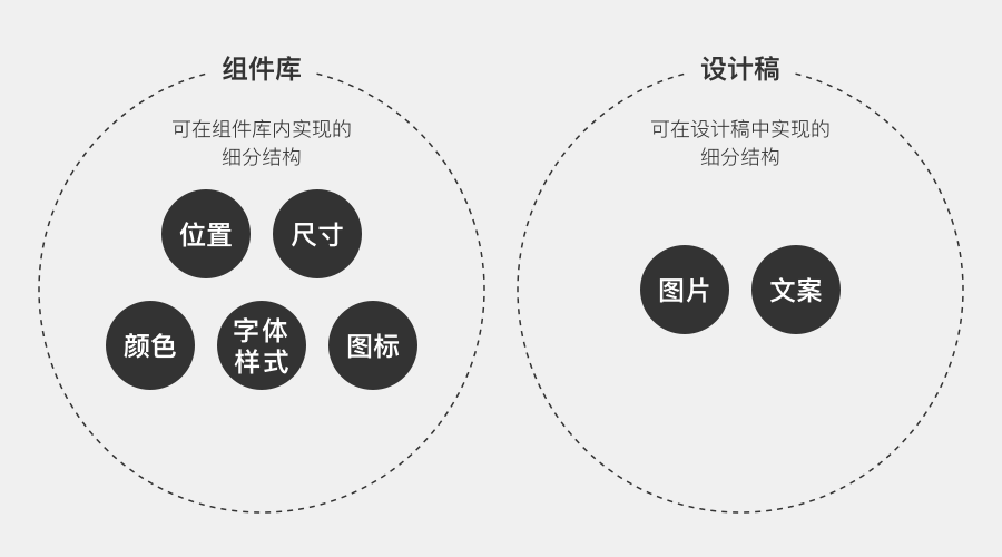 通常拆分后的布局可分为两个场景来表现,第一个场景是组件库可实现的细分结构,如位置、尺寸、颜色、字体样式、图标等;第二个场景是在设计稿中进行的细分,通常指图片、文案。