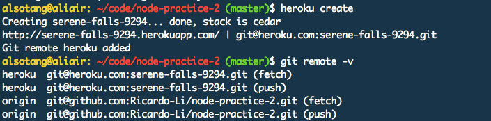 上述步骤完成后,我们进入 node-practice-2 的目录,执行 heroku create。这时候,heroku 会为我们随机取一个应用名字,并提供一个 git 仓库给我们。