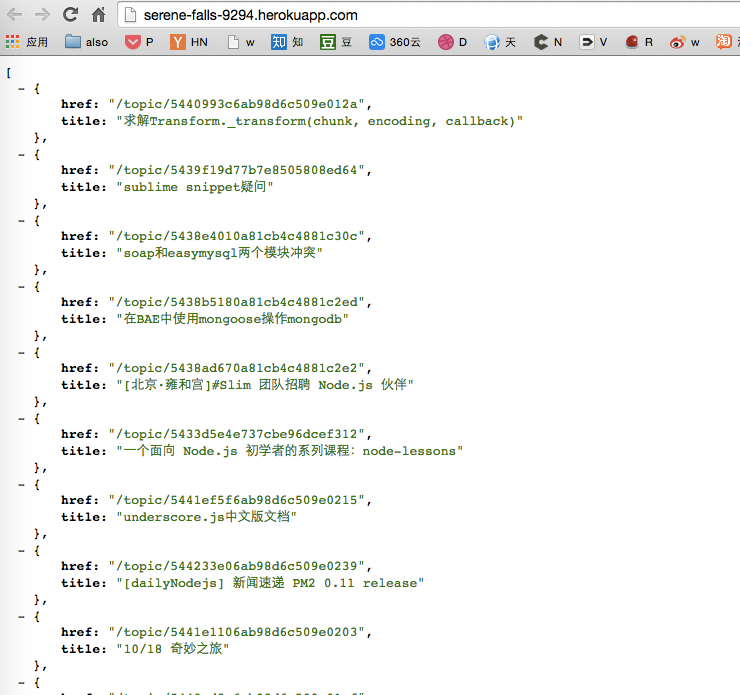 - 目标:当在浏览器中访问 http://localhost:3000/ 时,输出 CNode(cnodejs.org/ ) 社区首页的所有帖子标题和链接,以 json 的形式。