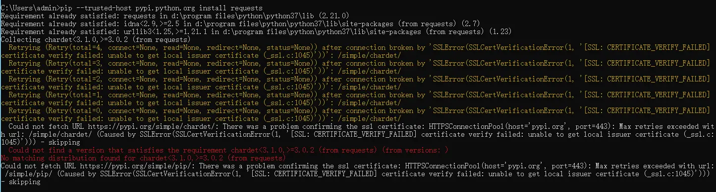 pip install requests或pip --trusted-host pypi.python.org install requests报错: