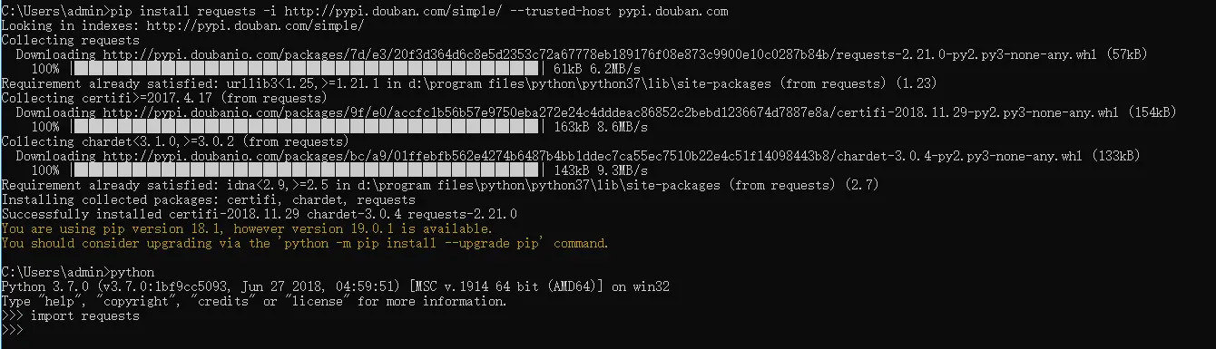 pip install requests -i http://pypi.douban.com/simple/ --trusted-host pypi.douban.com