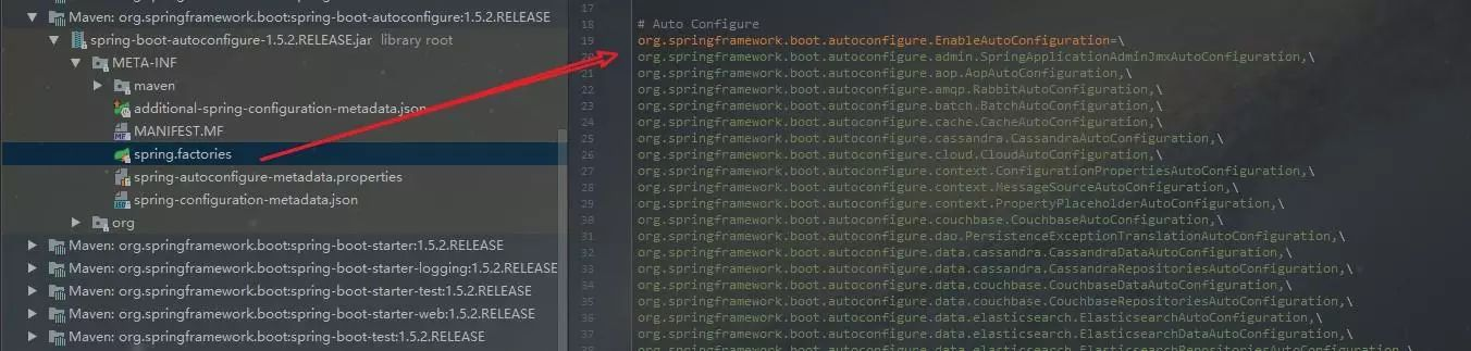 复制代码自动配置器会跟根据传入的factoryClass.getName()到项目系统路径下所有的spring.factories文件中找到相应的key,从而加载里面的类。我们就选取这个mybatis-spring-boot-autoconfigure下的spring.factories文件
