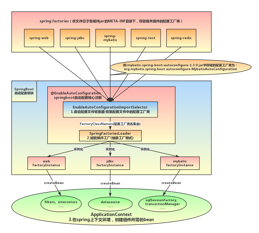复制代码里面最关键的是@Import(EnableAutoConfigurationImportSelector.class),借助EnableAutoConfigurationImportSelector,@EnableAutoConfiguration可以帮助SpringBoot应用将所有符合条件的@Configuration配置都加载到当前SpringBoot创建并使用的IoC容器。该配置模块的主要使用到了SpringFactoriesLoader。