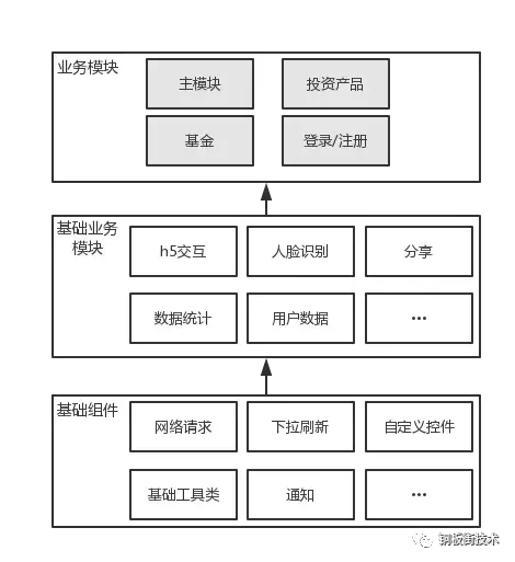 代码剥离过程为划分业务模块、基础业务模块、基础组件三部分;业务模块划分主要根据公司的产品线进行,划分粒度较大,包括普通投资产品、基金两大业务模块;基础业务模块涵盖各业务模块共用的业务逻辑,包括分享模块、H5交互模块、用户模块等;基础组件划分主要为了提取与业务无关的基础组件,包括网络请求、自定义控件、基础工具类等。最后划分出的模块架构如下图:
