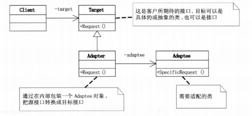 作为两个不兼容的接口之间的桥梁,使其可以一起工作。通常分为对象适配器和类适配器,对应的就是组合和继承,应该根据适用场景进行选择。