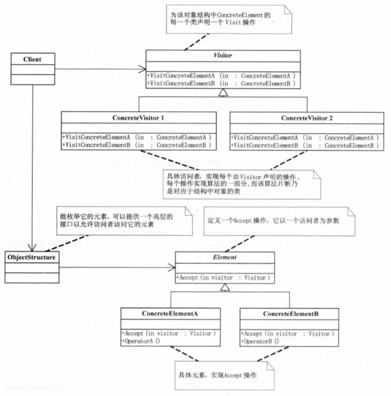 演化。使得增加新的操作很容易,因为增加新的操作就意味着增加一个新的访问者。