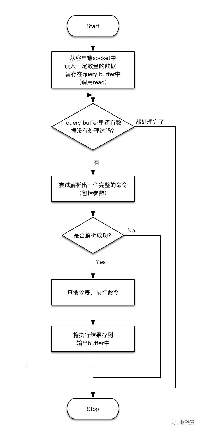 「粘包」处理的第二个表现,是上面流程图中的大循环。只要暂存输入数据的query buffer中还有数据可以处理,那么就不停地去尝试解析完整命令,直到把里面所有的完整命令都处理完,才退出循环。
