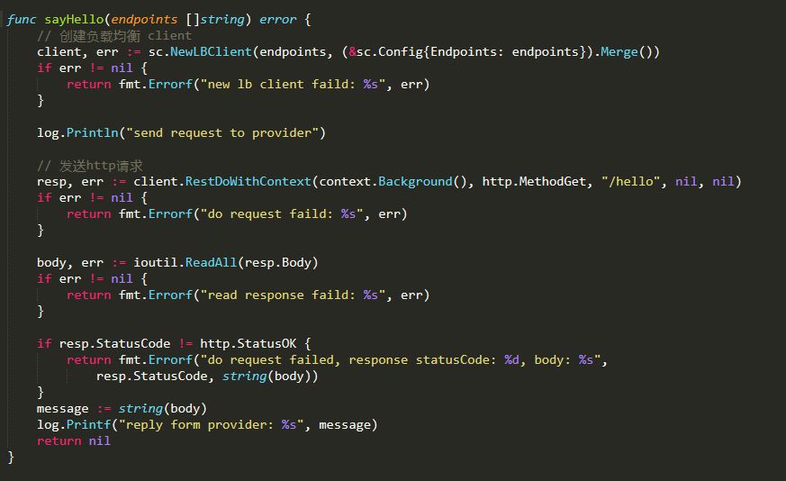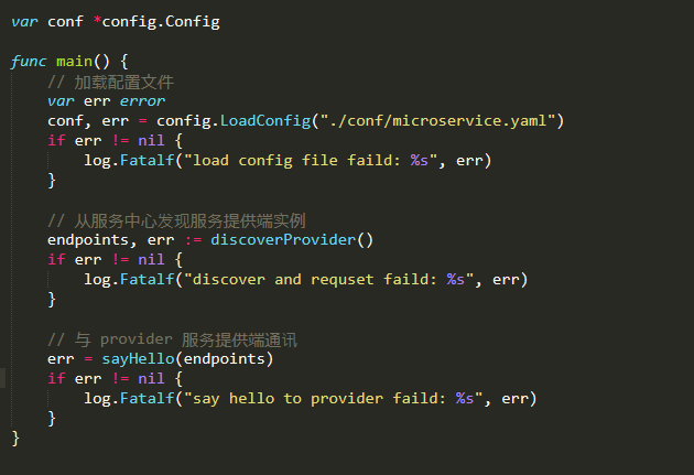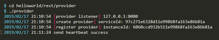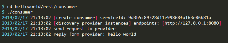 服务消费端成功创建微服务服务,并打印了返回的serviceId 服务消费端成功发现provider实例,并打印了返回的provider endpoints 服务提供端成功向服务提供端发送请求,并获得返回的信息“hello world”此时查看provider端控制台,若出现“2019/02/17 21:13:02 request from consumer”类似字样的打印,则说明provider端接收到consumer端的请求,共同印证了通讯的成功。