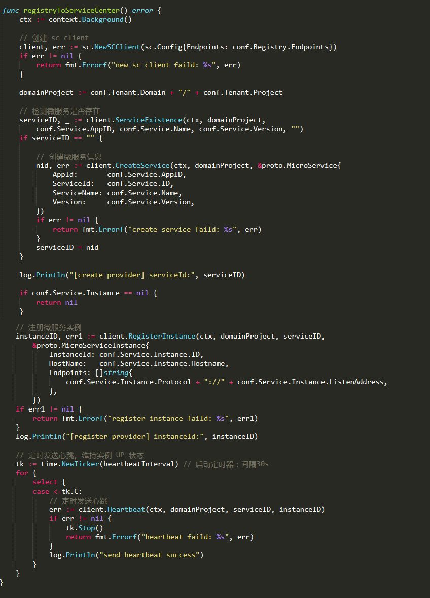 3.向Service-Center注册自身服务,其中包含微服务创建、实例注册、心跳保活三个部分,具体代码如下: