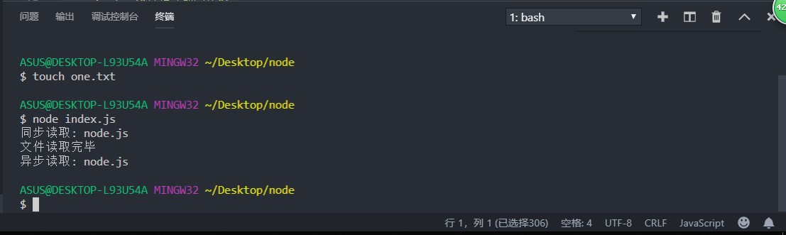 var fs = require("fs");// 异步读取fs.readFile('one.txt', function (err, data) { if (err) { return console.error(err); } console.log("异步读取: " + data.toString());});// 同步读取var data = fs.readFileSync('one.txt');console.log("同步读取: " + data.toString());console.log("文件读取完毕");终端输出如下: