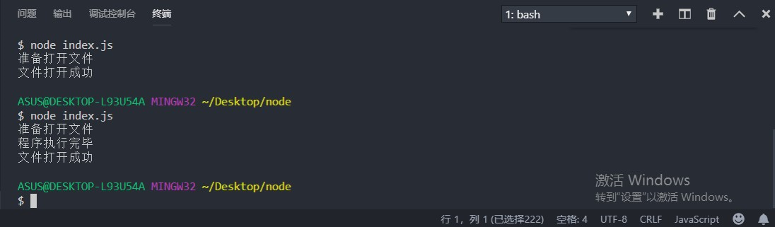 var fs = require("fs");// 异步打开文件console.log("准备打开文件");fs.open('one.txt', 'r+', function(err, fd) { if (err) { return console.error(err); } console.log("文件打开成功"); });console.log('程序执行完毕');终端输出如下: