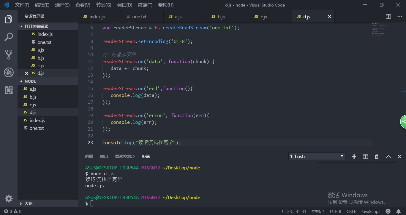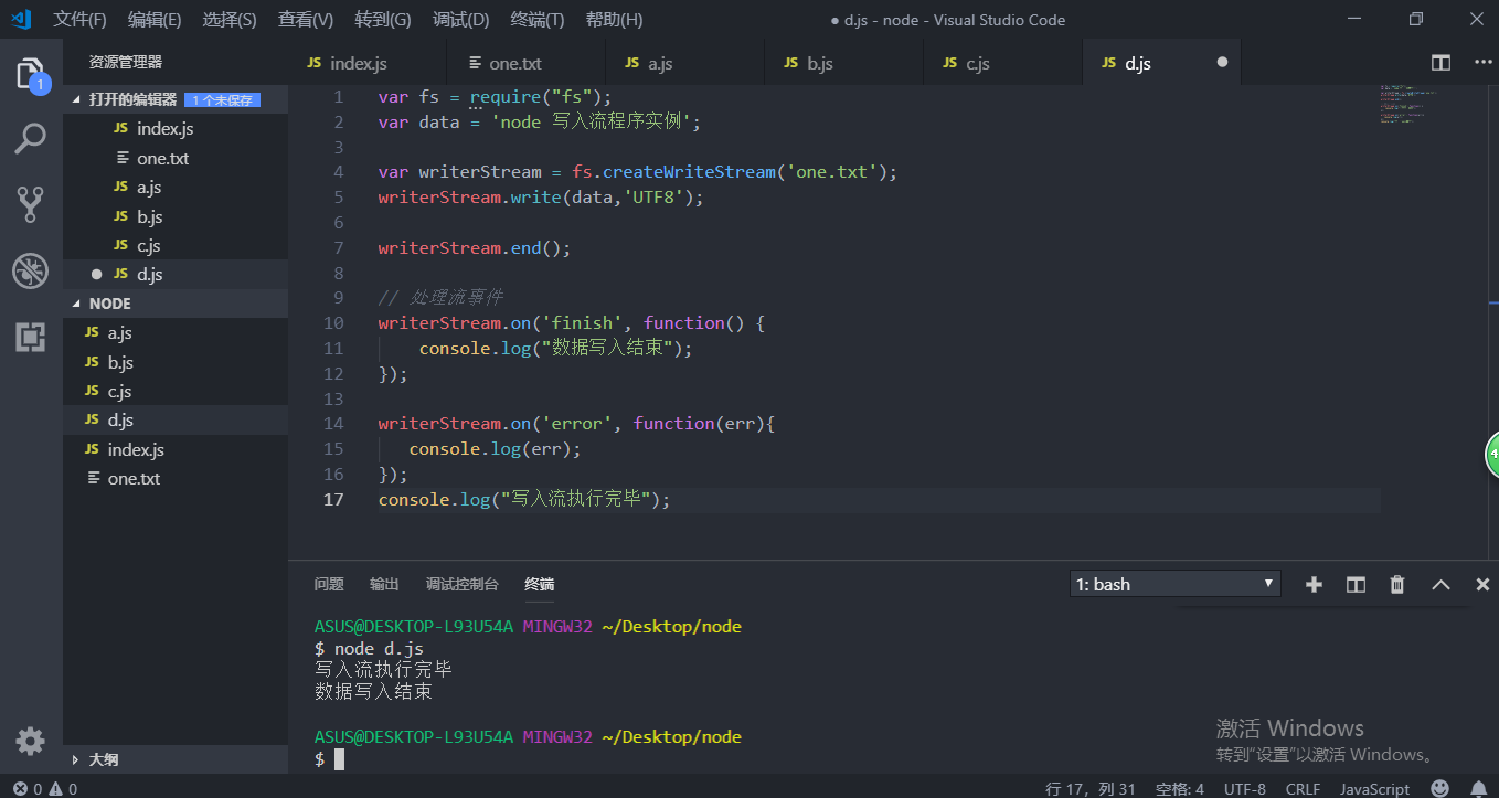 var data = 'node 写入流程序实例';var writerStream = fs.createWriteStream('one.txt');writerStream.write(data,'UTF8');writerStream.end();// 处理流事件 writerStream.on('finish', function() { console.log("数据写入结束");});writerStream.on('error', function(err){ console.log(err);});console.log("写入流执行完毕");