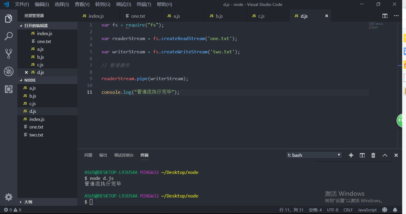 var readerStream = fs.createReadStream('one.txt');var writerStream = fs.createWriteStream('two.txt');// 管道操作readerStream.pipe(writerStream);console.log("管道流执行完毕");