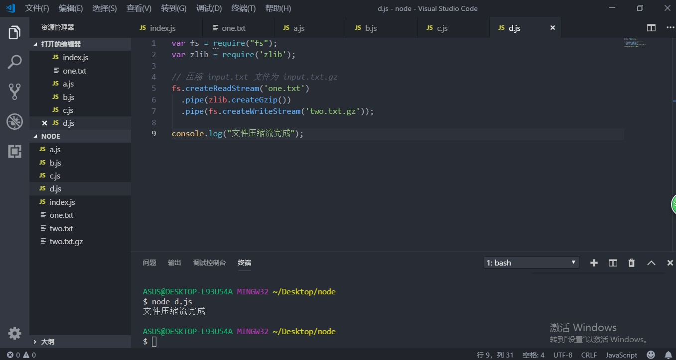 var fs = require("fs");var zlib = require('zlib');fs.createReadStream('one.txt') .pipe(zlib.createGzip()) .pipe(fs.createWriteStream('two.txt.gz'));console.log("文件压缩流完成");