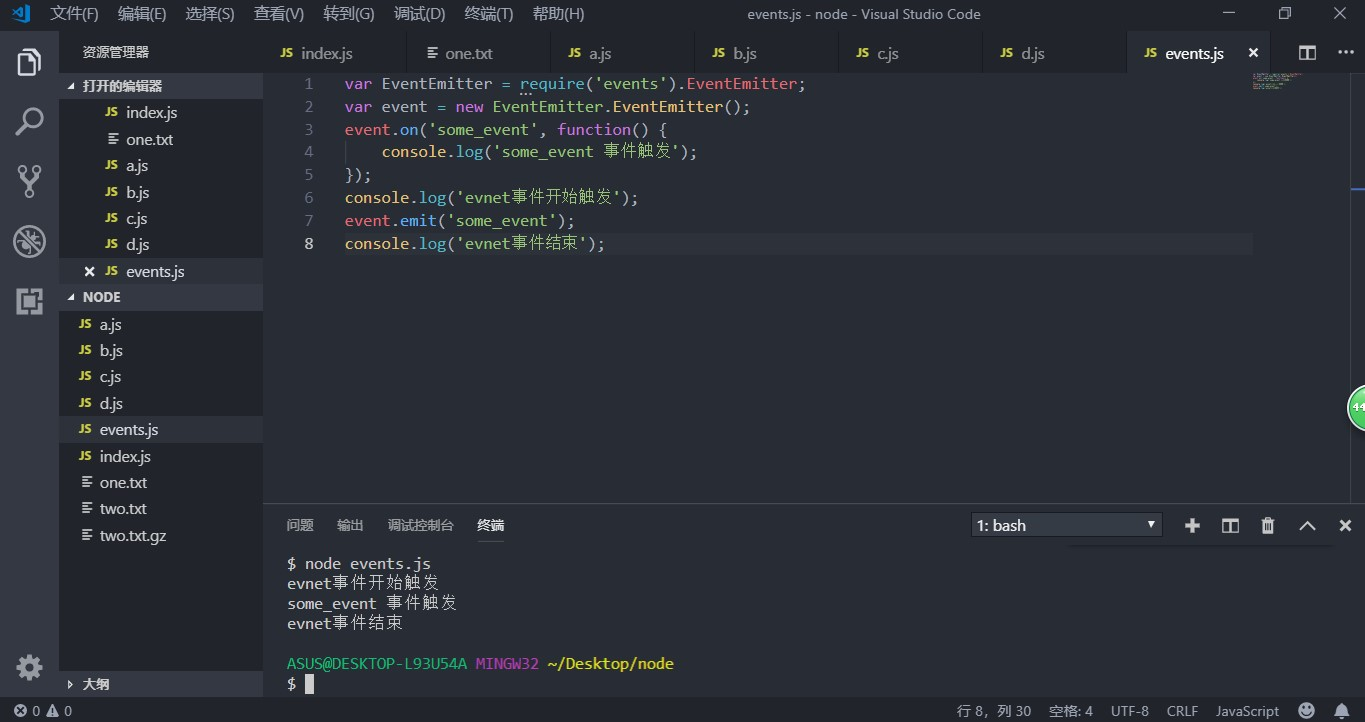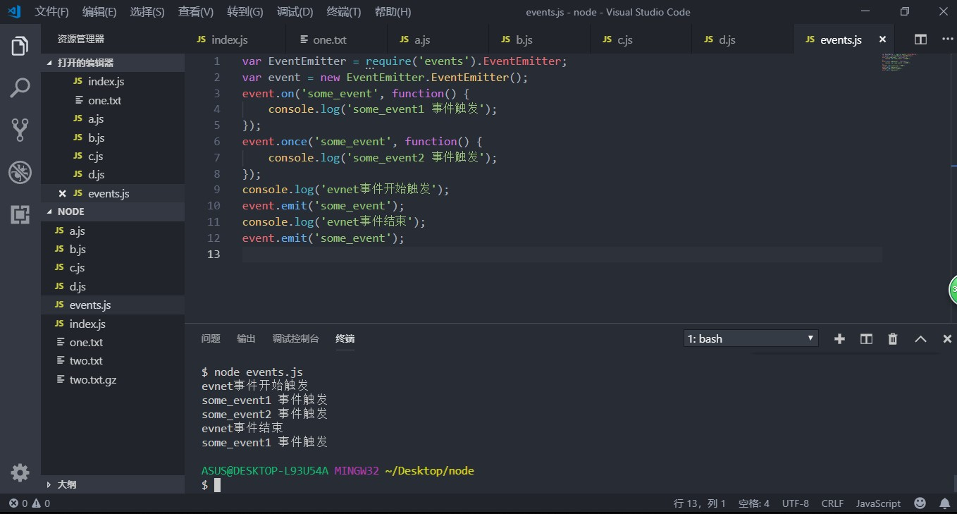 稍微解释一下,首先event对象通过event.on()注册了事件some_event的一个监听器,当代码执行到后面的时候event.emit(),发出了事件some_event,此时就调用了some_event的监听器。