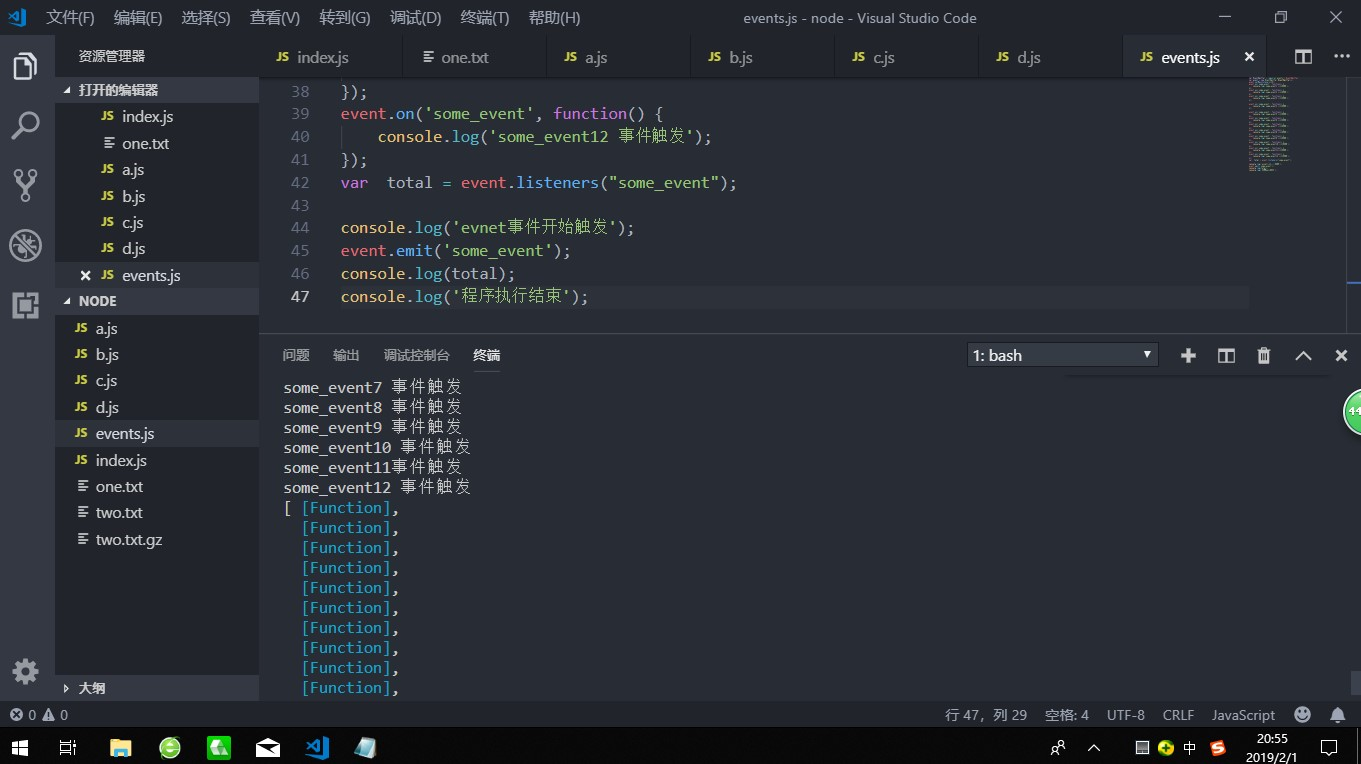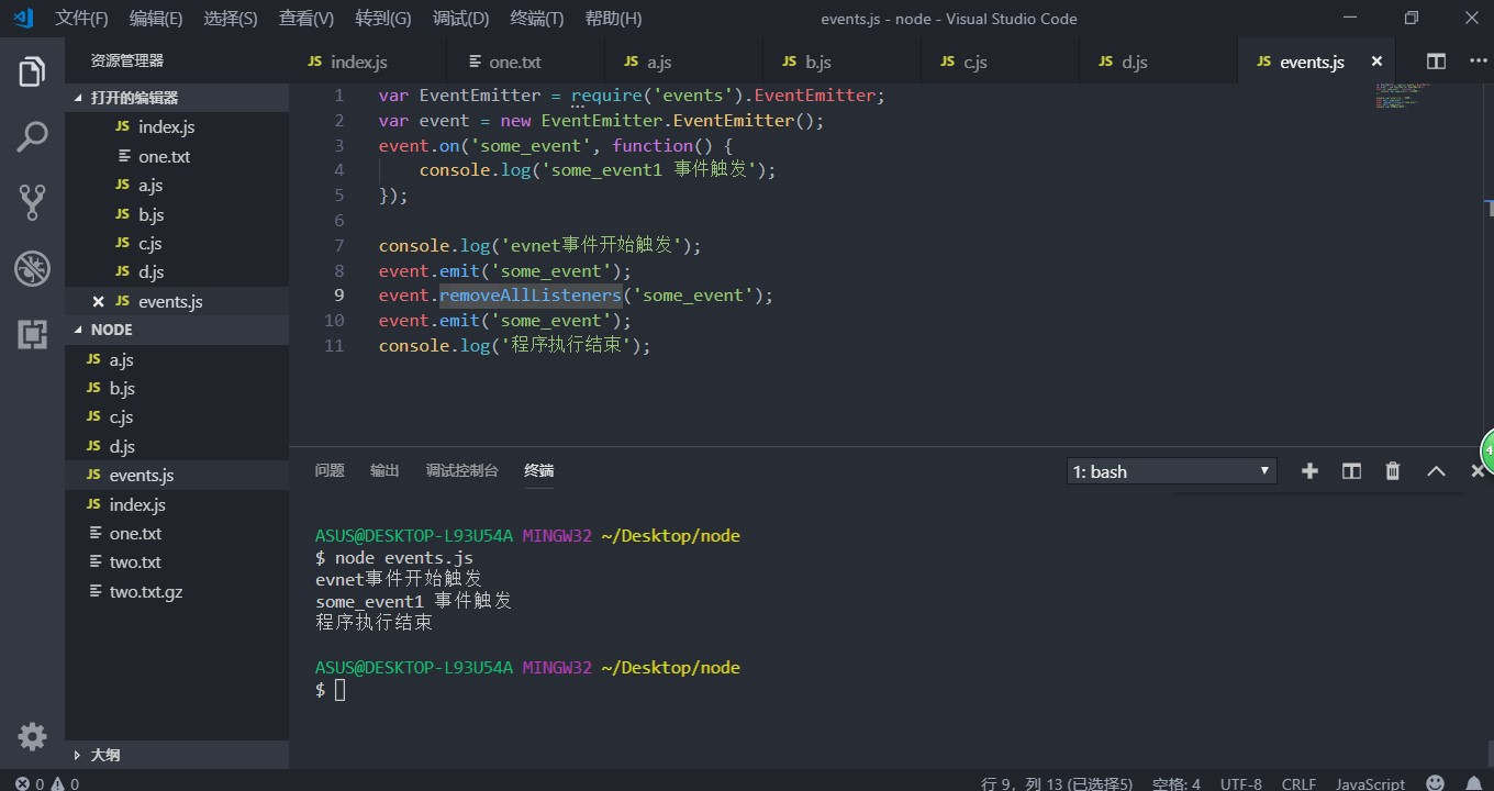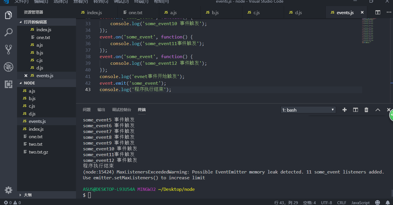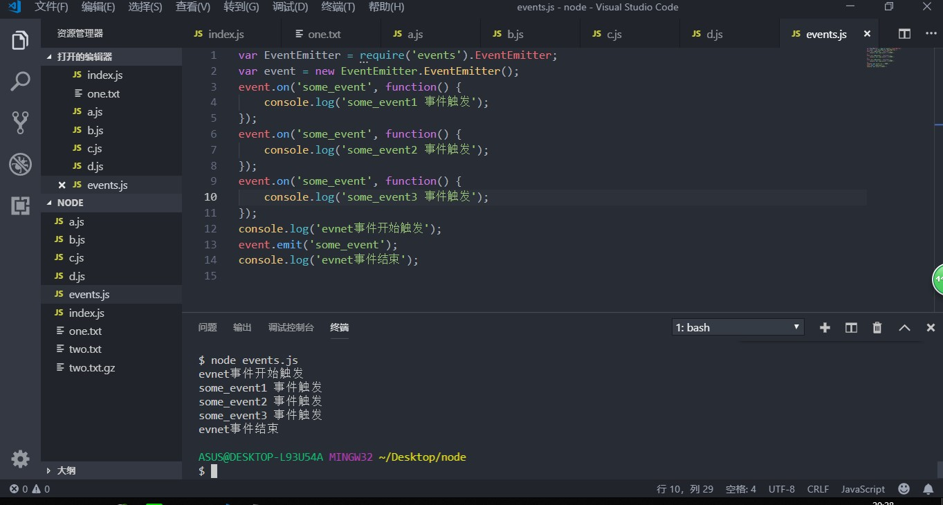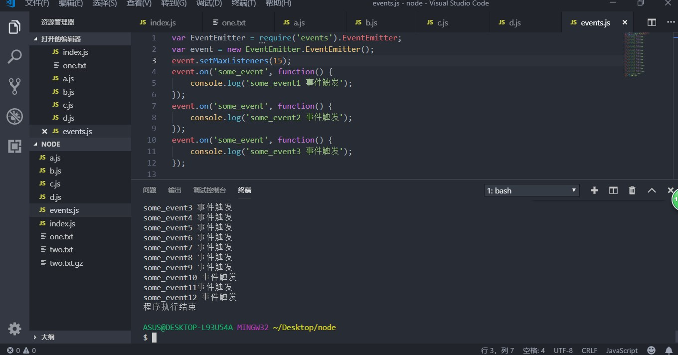 var EventEmitter = require('events').EventEmitter; var event = new EventEmitter.EventEmitter(); event.on('some_event', function() { console.log('some_event 事件触发'); }); console.log('evnet事件开始触发');event.emit('some_event'); console.log('evnet事件结束');