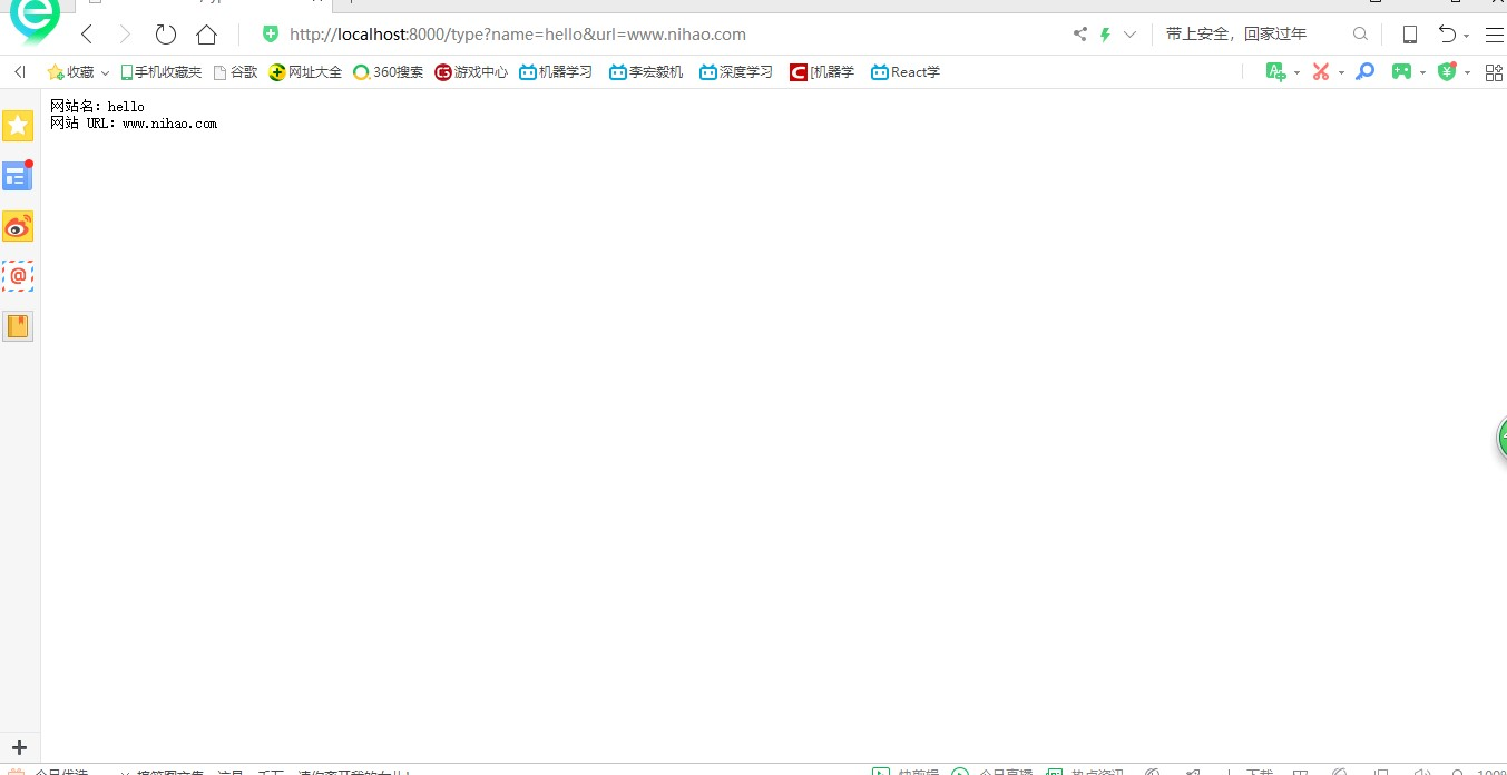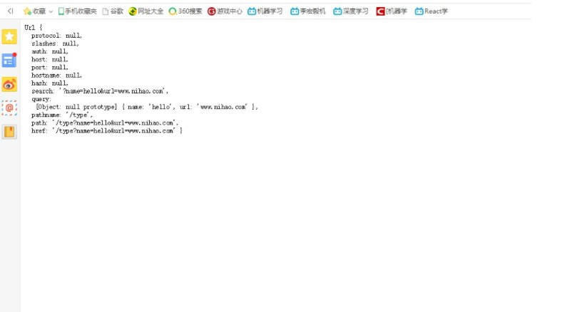 var http = require('http');var url = require('url');var util = require('util');http.createServer(function(req, res){ res.writeHead(200, {'Content-Type': 'text/plain; charset=utf-8'}); res.end(util.inspect(url.parse(req.url, true)));}).listen(8000);接着我们来访问8000端口,在浏览器中输入: http://localhost:8000/type?name=hello&url=www.nihao.com