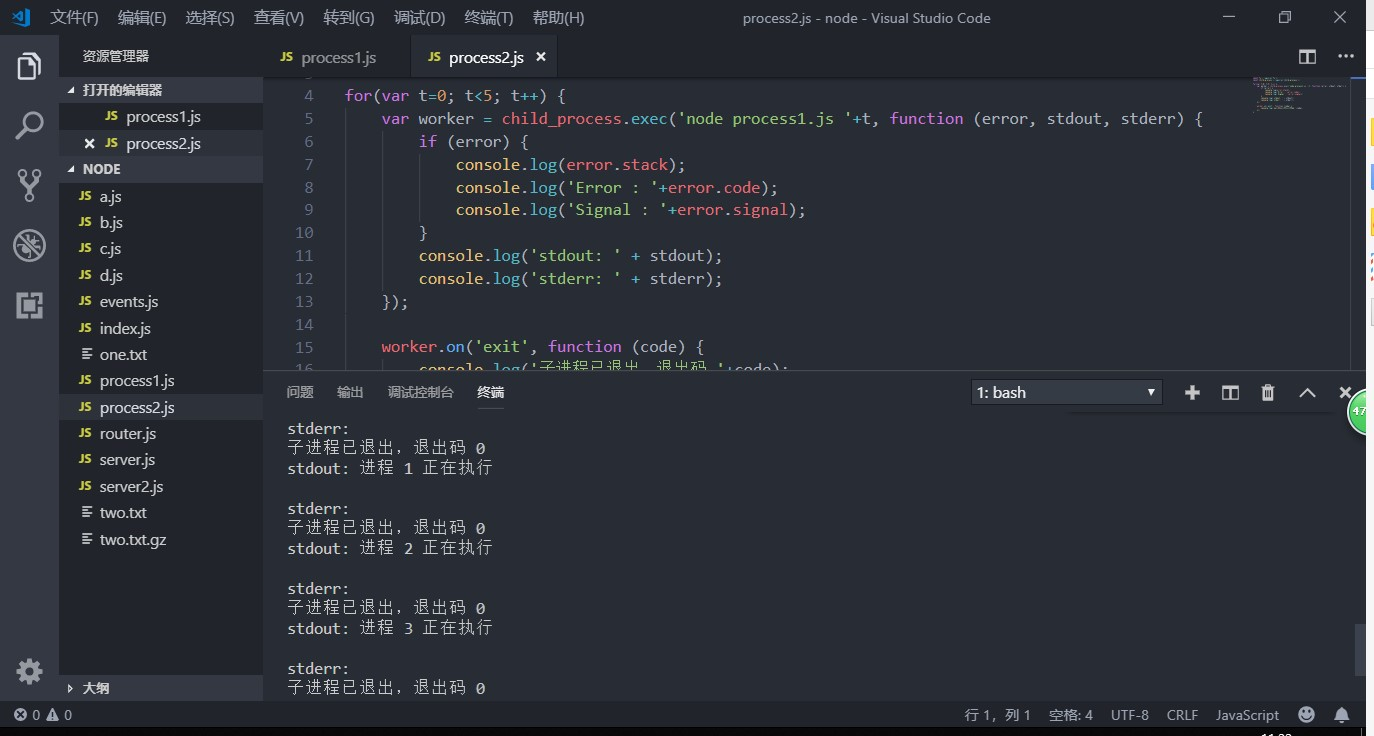 const fs = require('fs');const child_process = require('child_process');for(var t=0; t<5; t++) { var worker = child_process.spawn('node', ['process1.js', t]); worker.stdout.on('data', function (data) { console.log('stdout: ' + data); }); worker.stderr.on('data', function (data) { console.log('stderr: ' + data); }); worker.on('close', function (code) { console.log('子进程已退出,退出码 '+code); });}